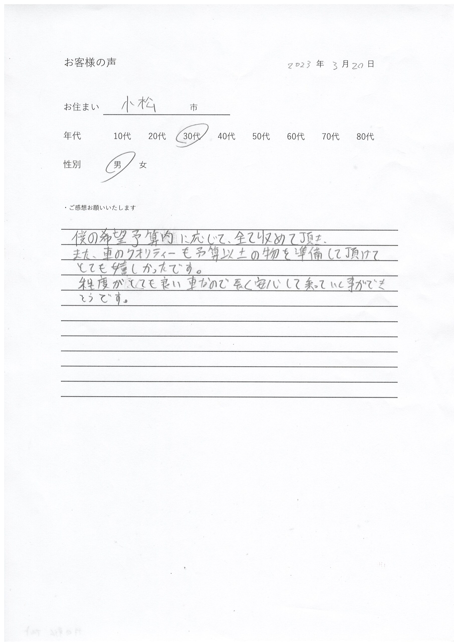 車のクオリティも予算以上 3月 20, 2023 umidesign 小松市30代(男性) 僕の希望予算内に応じて、 全て収めていただき、また、 車のクオリティも予算以上の物を準備いていただけてとても嬉しかったです。程度がとても良い車なので、長く安心して乗っていくことができそうです。