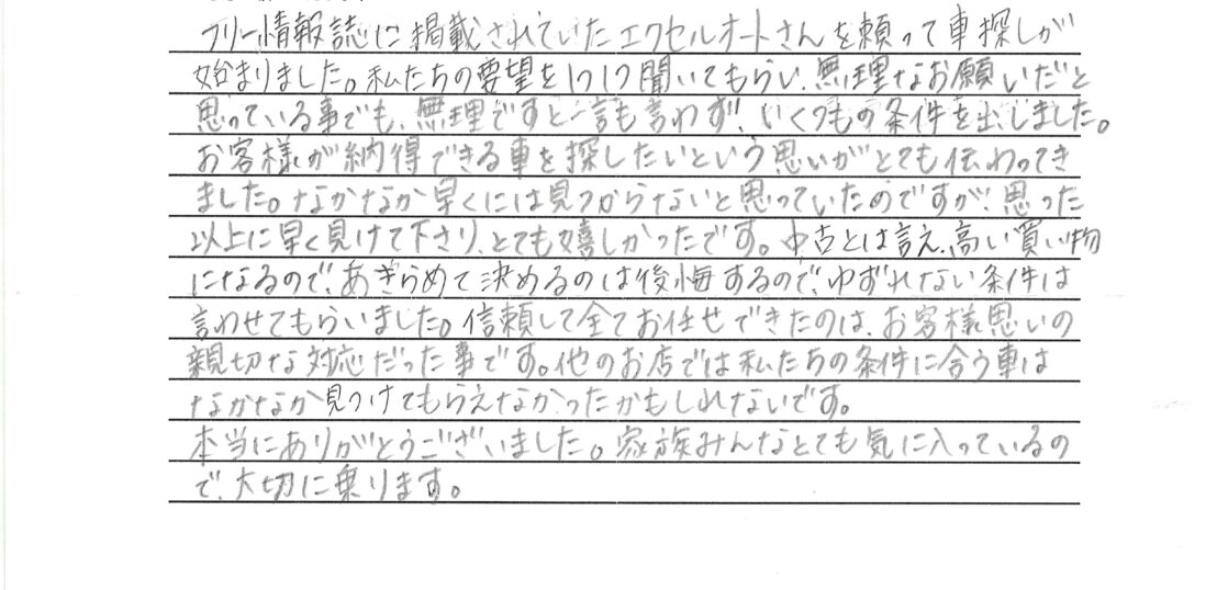 他のお店では私たちの条件に合う車はなかなか見つけてもらえなかったかもしれないです。