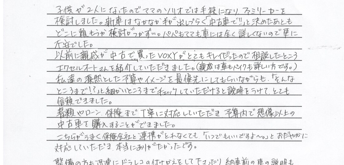 以前に親戚が中古で買ったVOXYがとてもキレイだったので相談したところ エクセルオートさんを紹介していただきました。(親戚は車もバイクも詳しい方です。)
