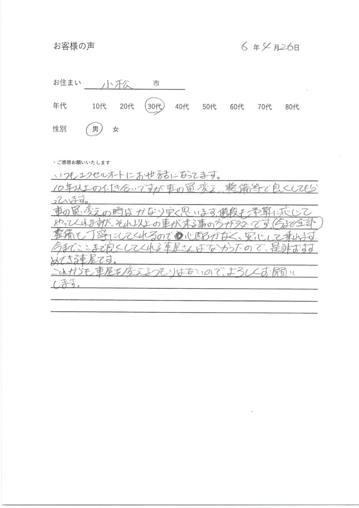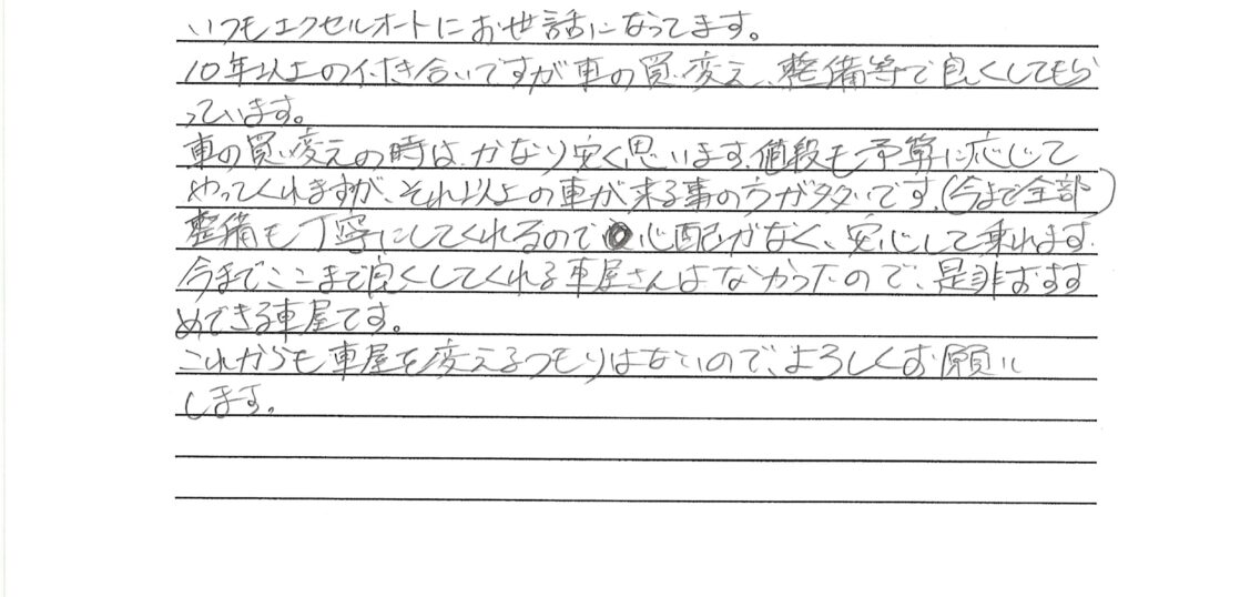整備も丁寧 4月 26, 2024 excelauto0866 小松市30代(男性) いつもエクセルオートにお世話になってます。 10年以上の付き合いですが車の買替え、整備等で良くしてもらっています。 車の買替えの時はかなり安く思います。値段も予算に応じてやってくれますが、それ以上の車が来る事の方が多いです。(今まで全部) 整備も丁寧にしてくれるので心配がなく、安心して乗れます。 今までここまで良くしてくれる車屋さんはなかったので、是非おすすめできる車屋です。 これからも車屋を変えるつもりはないので、よろしくお願いします。