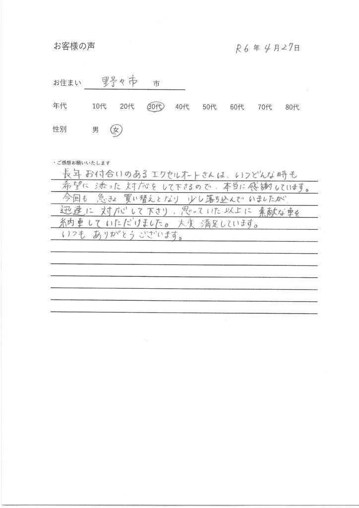 希望に添った対応 4月 27, 2024 excelauto0866 野々市市30代(女性) 長年お付合いのあるエクセルオートさんは、いつどんな時も希望に添った対応をして下さるので、本当に感謝しています。 今回も急きょ買い替えとなり少し落ち込んでいましたが迅速に対応して下さり、思っていた以上に素敵な車を納車していただけました。 大変満足しています。 いつもありがとうございます。