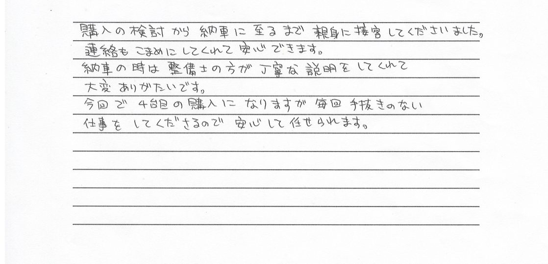毎回手抜きのない仕事を 10月 31, 2024 excelauto0866 川北町40代(男性) 購入の検討から納車に至るまで親身に接客してくださいました。 連絡もこまめにしてくれて安心できます。 納車の時は整備士の方が丁寧な説明をしてくれて大変ありがたいです。 今回で4台目の購入になりますが毎回手抜きのない仕事をしてくださるので安心して任せられます。